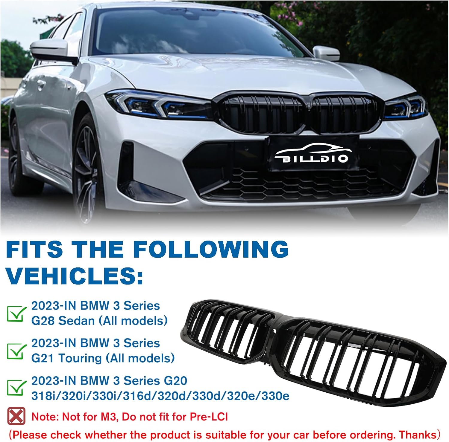 Upgrade the front fascia of your BMW 3 Series with the BILLDIO Gloss Black Double Slat Kidney Grille, engineered specifically for the 2023 and newer G20 and G28 LCI models. Featuring a bold double slat design finished in high-gloss black, this grille delivers an aggressive, sporty aesthetic that transforms the look of your 320i, 330e, 330i, or M340i sedan without the need for expensive dealer upgrades or custom bodywork.
