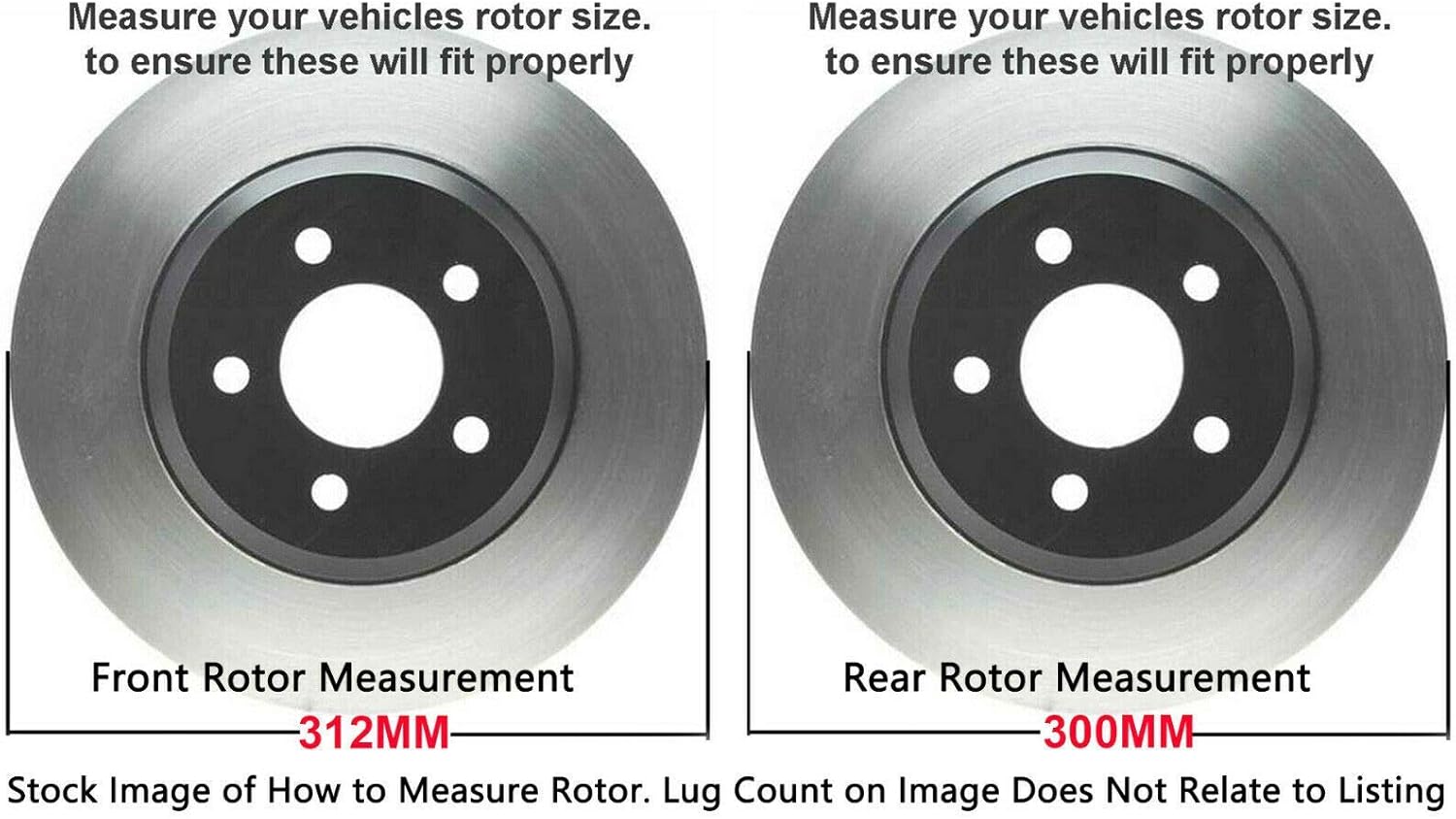 - Front rotors measure 12.30" (312mm); rear rotors measure 11.81" (300mm) — OEM-matched sizing