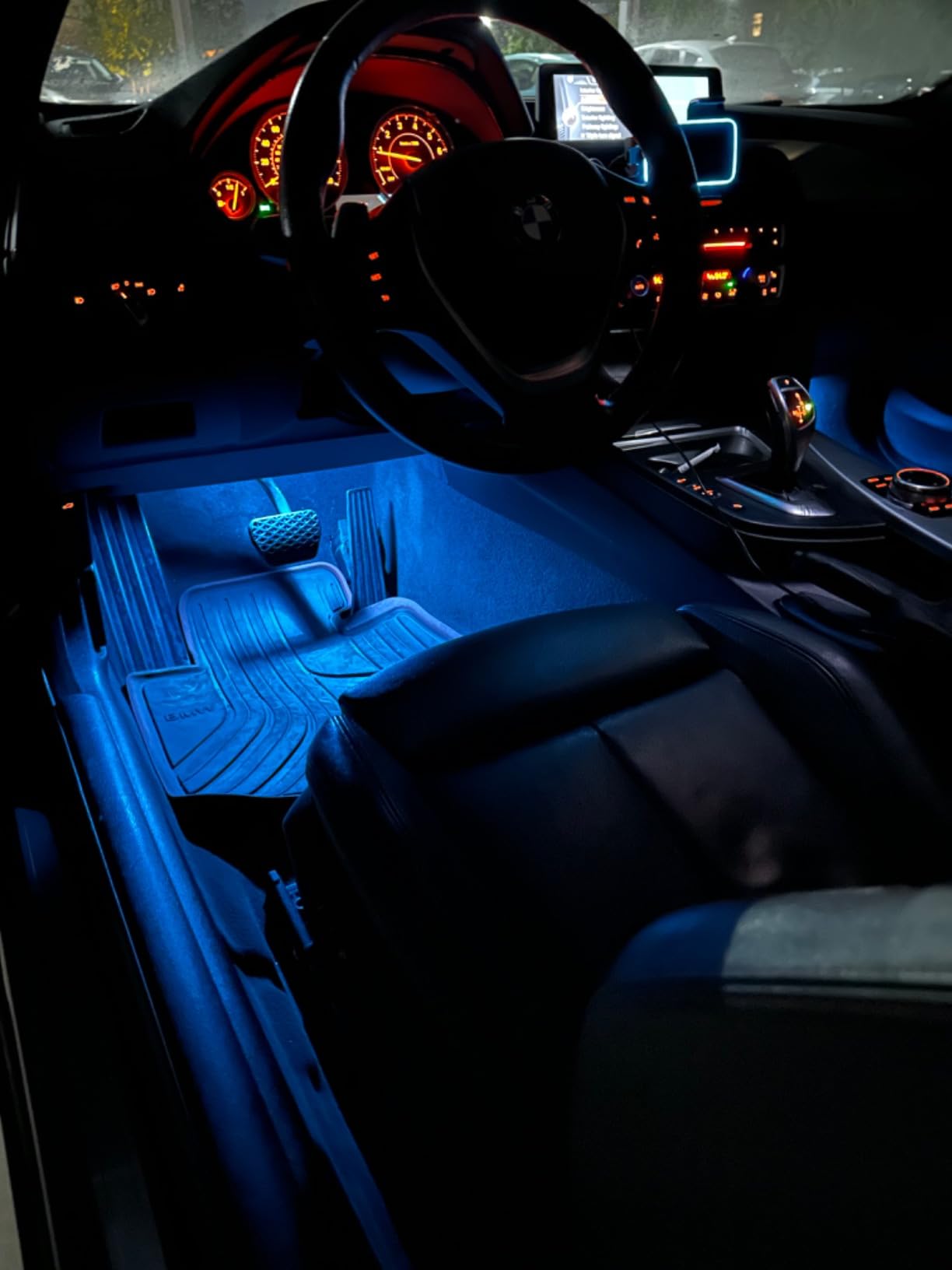 The dual-color lighting is the centerpiece of this panel. Orange delivers a warm, upscale OEM-plus glow that pairs naturally with BMW's interior design language — think M-sport refinement without the sticker price. Flip to blue and the mood shifts entirely, giving the cockpit a sharper, more aggressive character that suits spirited driving. Both modes are adjustable in brightness through either the headlight dimmer stalk or the iDrive touchscreen, giving you granular control over exactly how the cabin looks after dark.