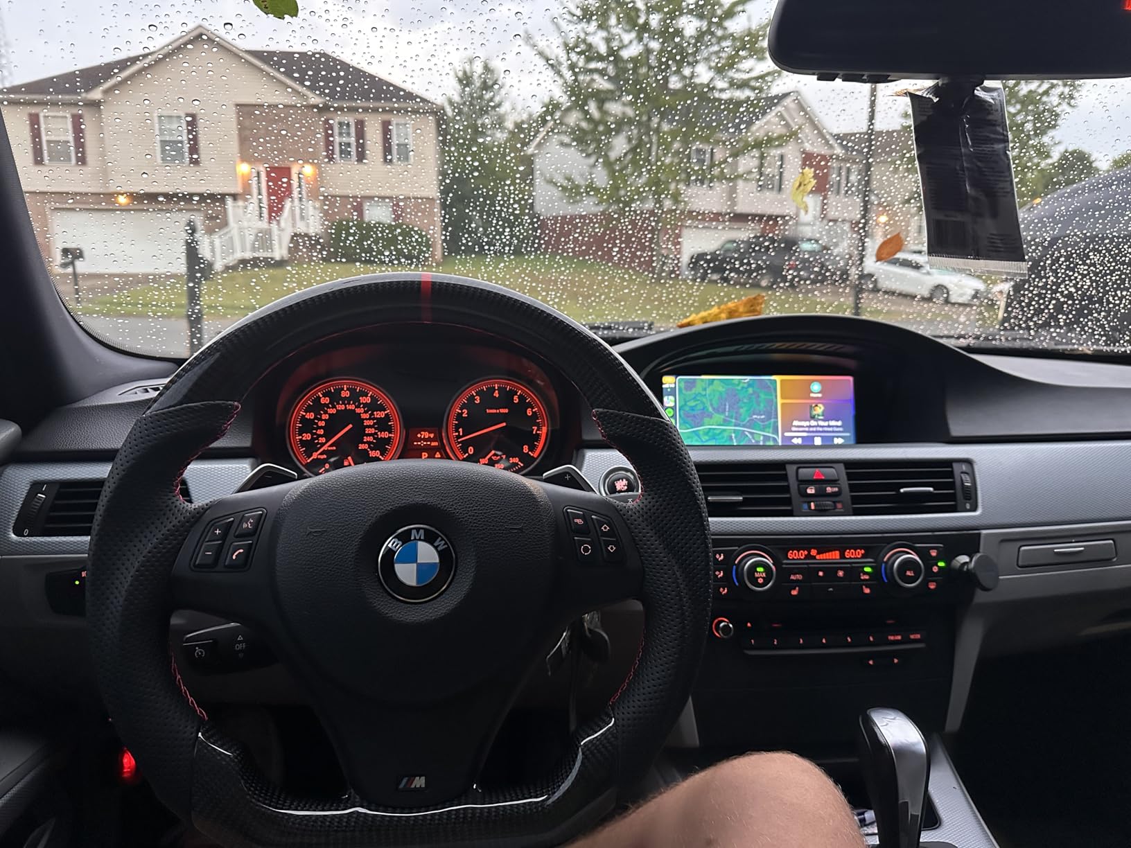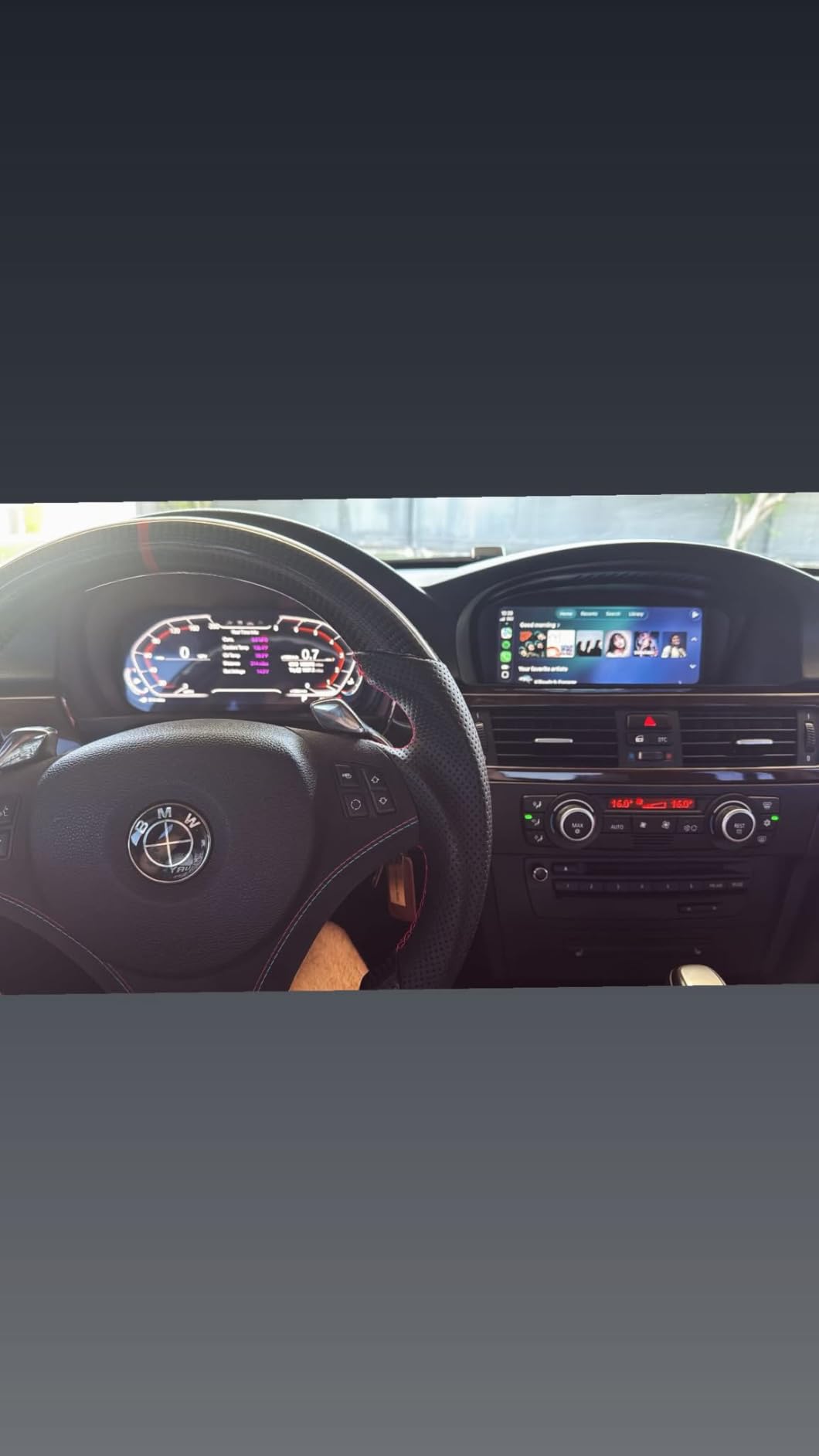 The grips are wrapped in perforated leather with hand-stitched red thread, offering a breathable, sweat-wicking feel during spirited drives. The combination of carbon fiber and premium leather stitching gives the interior a purposeful, track-inspired aesthetic without sacrificing everyday comfort.