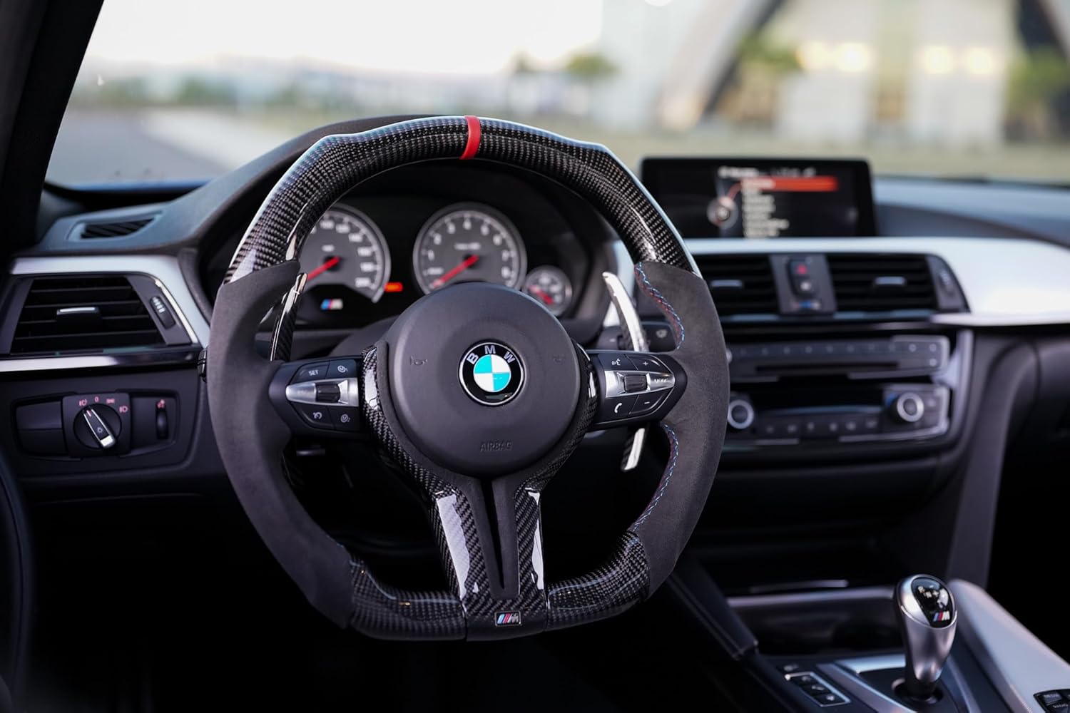 Material choices here are deliberately premium. The gripping surface is wrapped in genuine Alcantara, which delivers a tactile, fatigue-resistant hold that factory leather simply can't match — especially during spirited driving. Carbon fiber accents frame the spokes cleanly, and a bold red leather center stripe adds a sharp visual anchor without tipping into excess. Together, these materials give the wheel a purposeful, motorsport-influenced aesthetic that looks at home in everything from a daily F30 335i to a track-prepped F80 M3.
