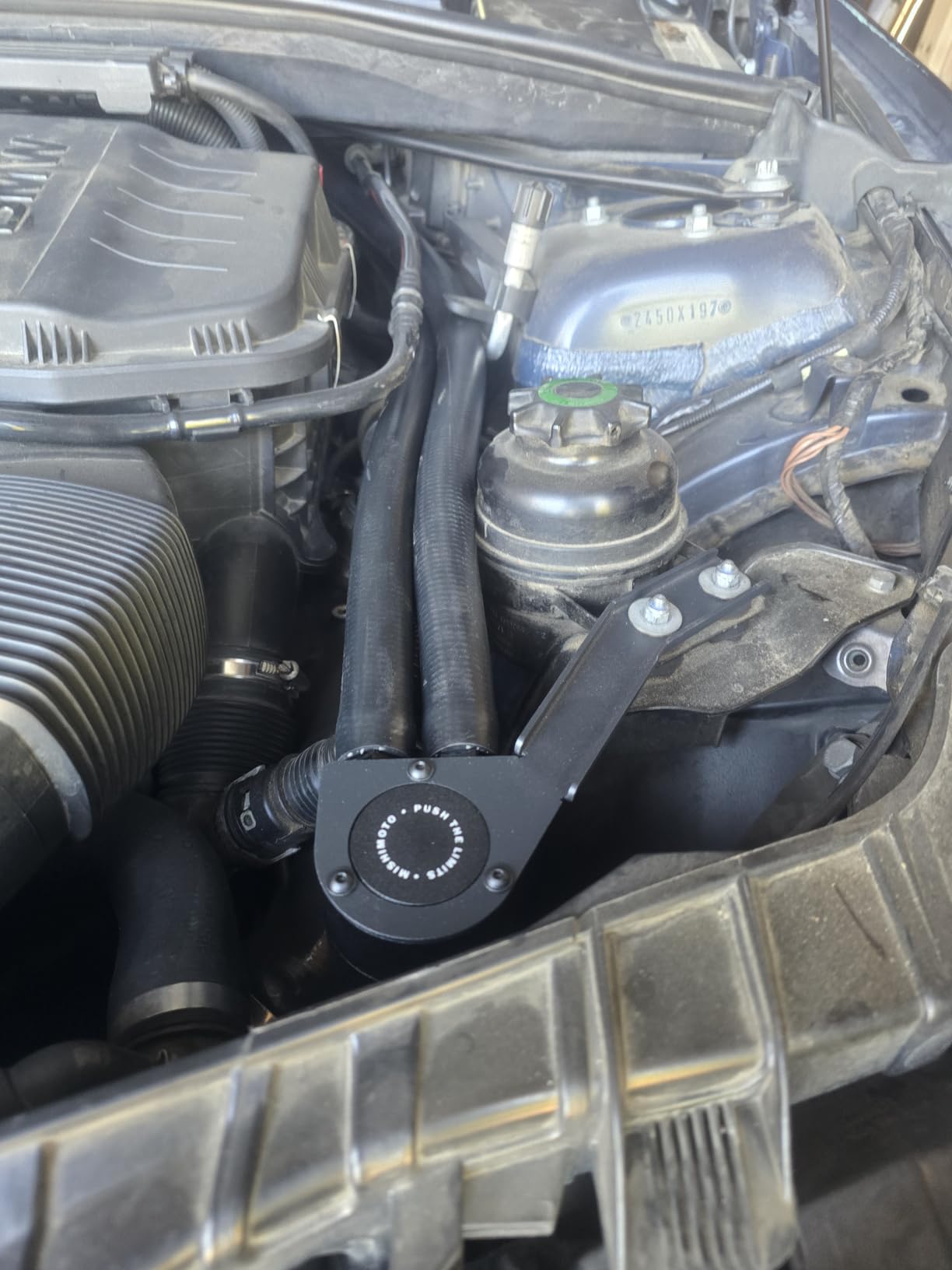 Installation is as straightforward as this type of upgrade gets. The kit includes two direct-fit hoses and a dedicated mounting bracket that positions the can in a serviceable location without touching the engine cover. Both hoses connect via 3/4-inch plastic barb fittings and route cleanly into the existing CCV circuit — true plug-and-play fitment for 2007–2010 N54-powered BMWs including the 135i, 335i, and 535i.