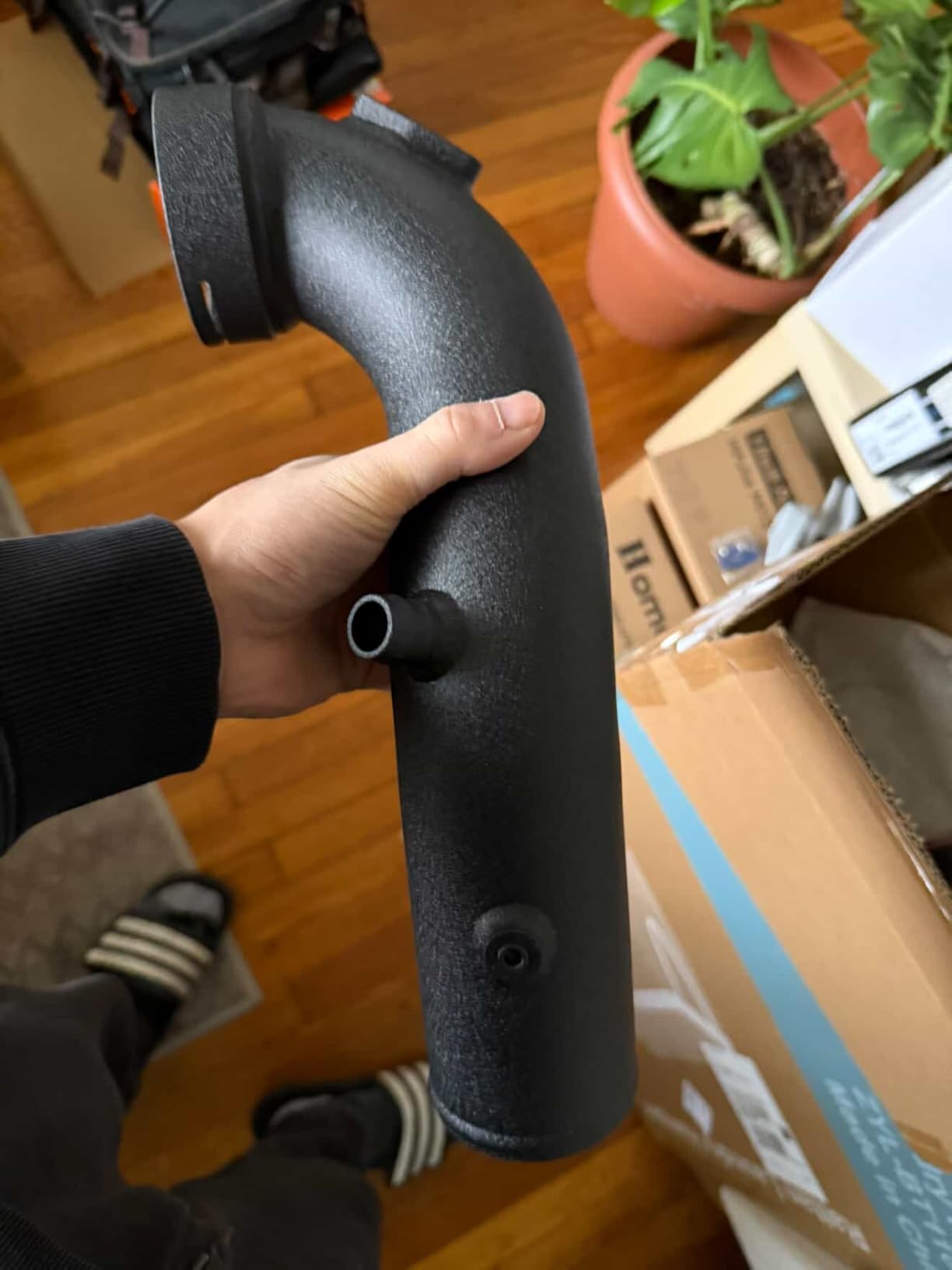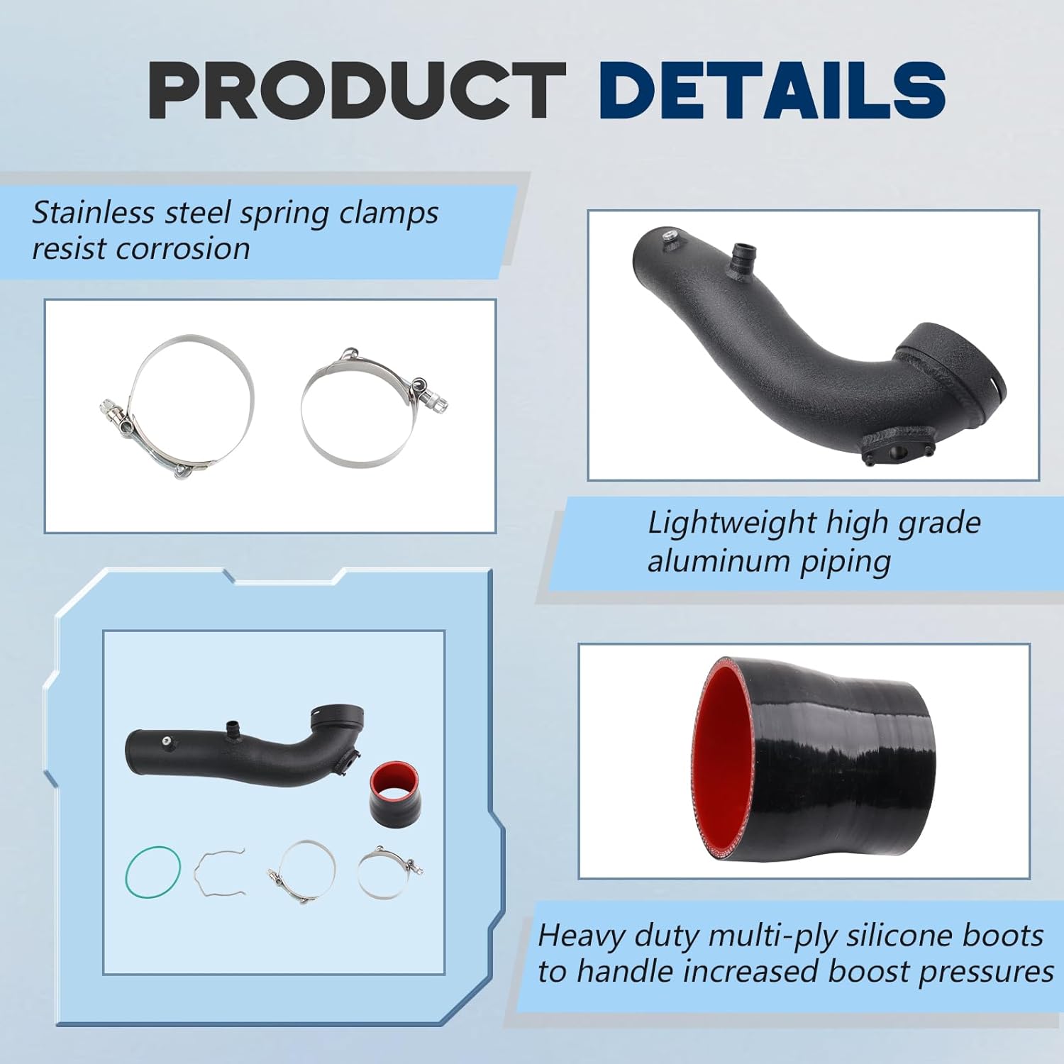 - Powder-coated black aluminum construction replaces failure-prone OEM plastic charge pipe