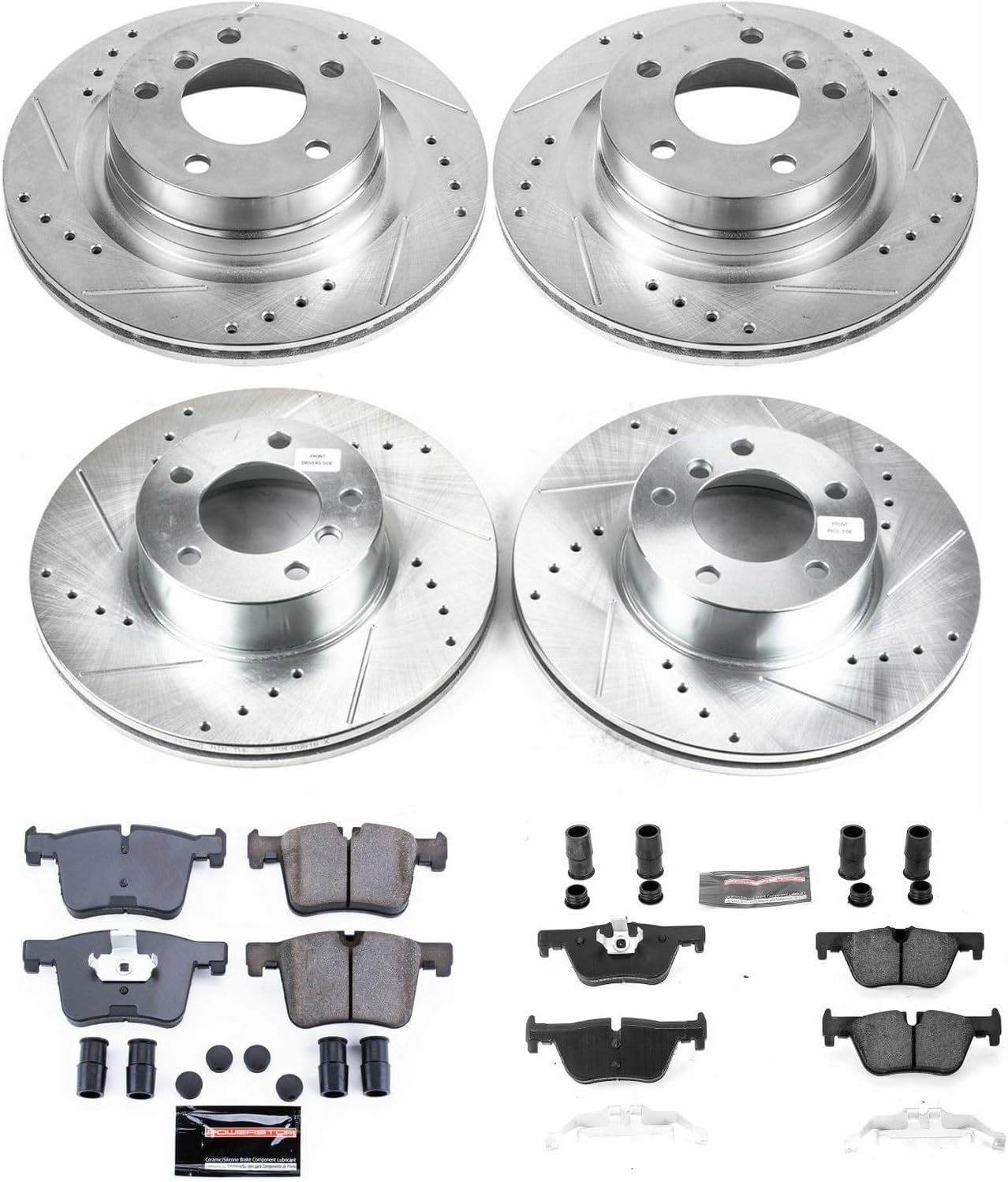 - Complete front and rear kit: 4 rotors, 4 pad sets, rubberized shims, and stainless steel hardware included