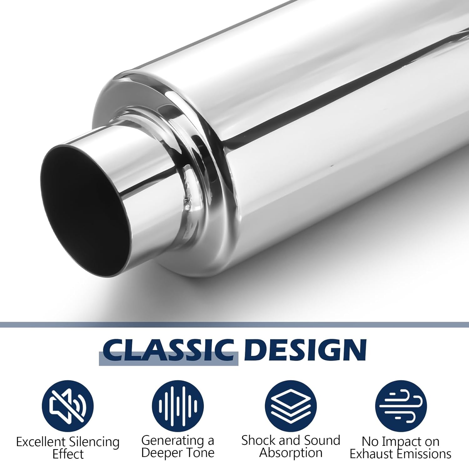 The straight-through design is the key differentiator here. Unlike traditional chambered mufflers that use baffles to physically slow and redirect exhaust gases, these resonators use tuned internal geometry to cancel specific sound frequencies — particularly the mid-range drone that plagues highway cruising on modified cars — while leaving exhaust flow largely unrestricted. The result is a smoother, less fatiguing exhaust note without a measurable hit to power or throttle response.