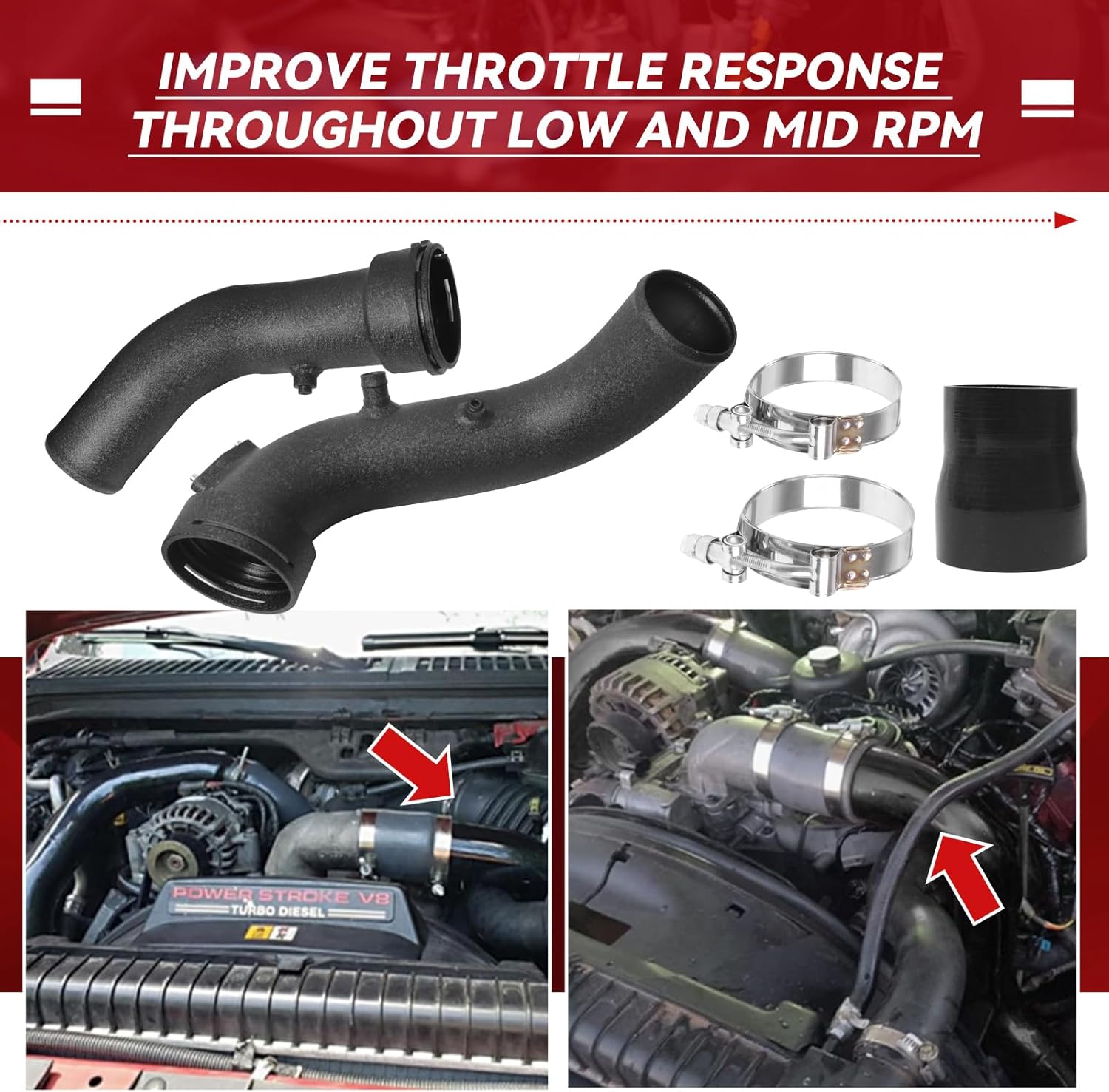 - Heavy-duty four-ply silicone boots and stainless steel T-bolt clamps provide a secure, leak-free seal