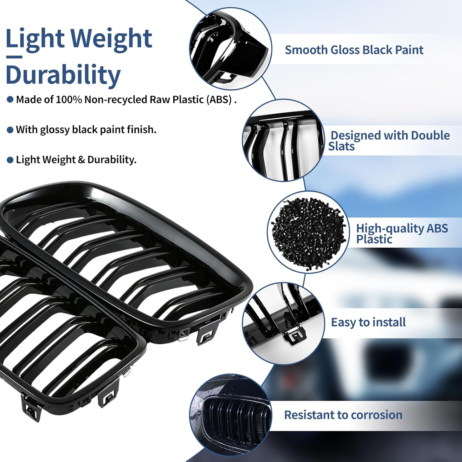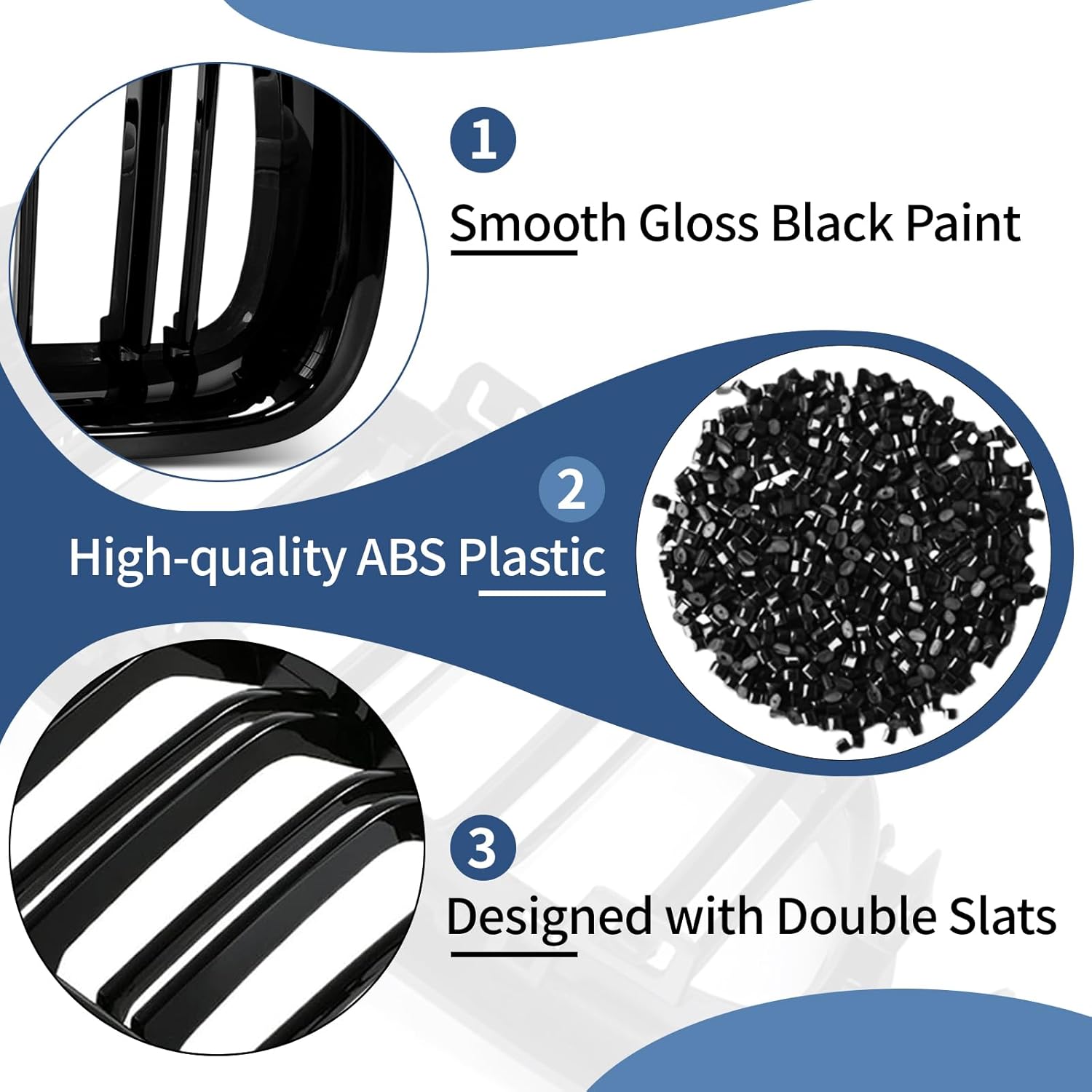 - Includes both left and right kidney grille pieces in a matched gloss black finish.